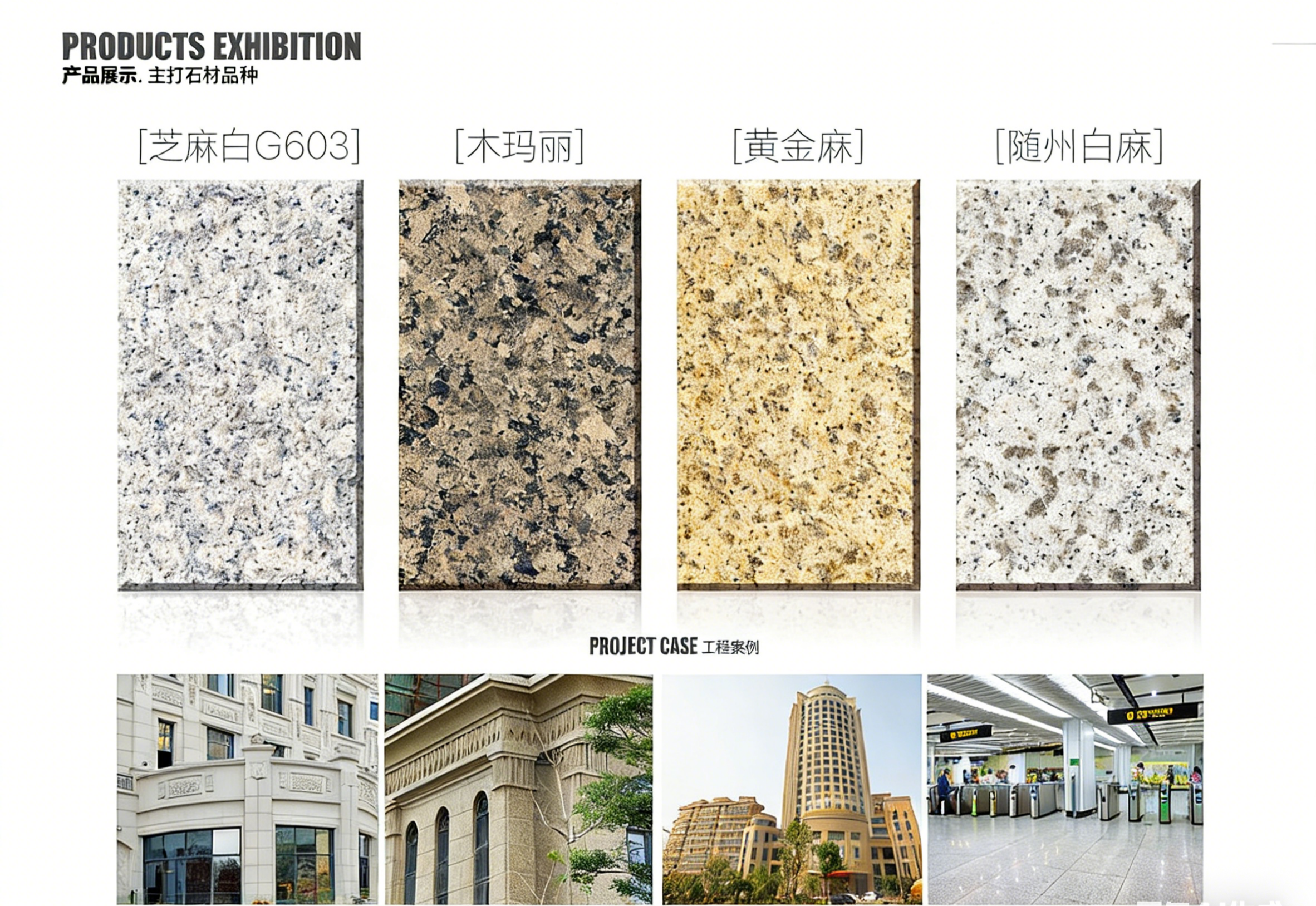 :其提供的花岗岩产品以质地坚硬、光泽度好、色差小、纹路均匀著称。具备优异的耐磨损、耐酸碱、抗风化物理特性,经久耐用,尤其适合应用于对材料有高标准要求的公共建筑、交通枢纽及高端商业项目。